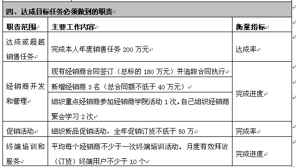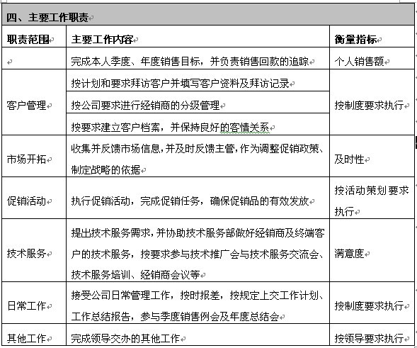 上述案例的結(jié)論是:崗位說(shuō)明書的實(shí)際功能是讓銷售人員明白自己為了達(dá)成目標(biāo)要做什么?公司內(nèi)部有哪些資源可以支持他達(dá)成目標(biāo)?除此兩方面外的其它內(nèi)容,對(duì)于崗位操作人員都是無(wú)效的。因此,崗位說(shuō)明書的格式及內(nèi)容,做到簡(jiǎn)明有效就好。