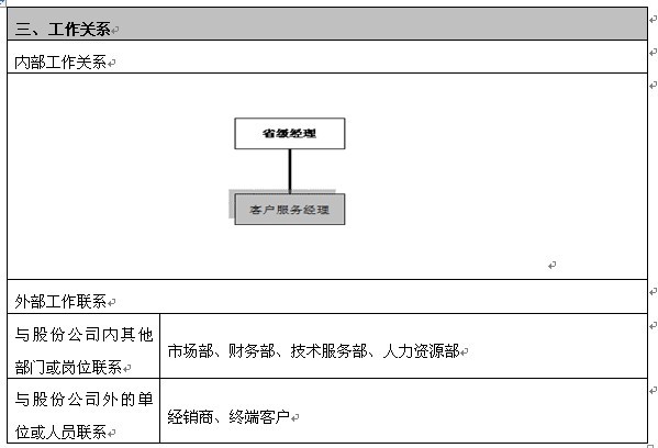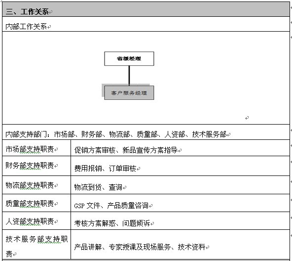 二、編寫銷售崗位說(shuō)明書,必須遵循“源于崗位一線”的原則。三個(gè)要求:(1)誰(shuí)明白(市場(chǎng)特點(diǎn):產(chǎn)品銷售處在的階段、產(chǎn)品擁有的終端用戶和購(gòu)買習(xí)慣、經(jīng)銷商的首要需求、銷售活動(dòng)組織形式)、誰(shuí)起草,如果人力資源部門是起草人,就必須深入到銷售一線崗位了解市場(chǎng)情況再打草稿;(2)與銷售人員的實(shí)際能力匹配(閱歷和能力);(3)明確銷售支持部門(人員)的職責(zé)(姓名、聯(lián)系方式)。