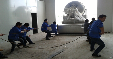 在新車間的設(shè)備安裝與定位的過程中,受一些不可避免因素的影響,很多棘手的困難總是突如其來。例如,新車間的功能間已隔離完畢,車間的外圍已封閉、定型。然而,外面的道路卻還沒有完全填平、硬化,那么怎樣將一臺(tái)6噸多重二維混合機(jī)準(zhǔn)確、安全定位?困難擺在眼前,大家聚集在一起,商討對(duì)策。用叉車,道路和門的尺寸都不夠高,叉車無法進(jìn)入;請(qǐng)吊車,車間外圍已封閉定型,吊車也愛莫能助!最終,大家提議利用滾動(dòng)的方式對(duì)二維混合機(jī)進(jìn)行定位。