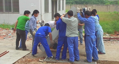 午飯后,大家顧不上休息。來自各個(gè)部門的十五六名青壯年,聚集在設(shè)備安裝現(xiàn)場(chǎng)。在郝康廠長的帶領(lǐng)和指揮下,所有人一共分為三個(gè)小組。第一個(gè)小組負(fù)責(zé)在混合機(jī)下面鋪設(shè)鋼管,使二維混合機(jī)能始終在鋼管上滾動(dòng)。第二個(gè)小組在后面,負(fù)責(zé)推、撬動(dòng)混合機(jī)。第三個(gè)小組則在前面依靠纜繩使勁地拉動(dòng)混合機(jī)。在“一、二、三”的吶喊聲中,大家配合的很默契,二維混合機(jī)也朝著預(yù)定的方向蠕動(dòng)著。一兩個(gè)小時(shí)過去了,大家的聲音變得嘶啞了,衣服也都被汗水浸透了。值得欣慰的是,二維混合機(jī)最后以“倒車入庫”的方式準(zhǔn)確、安全地定位了。